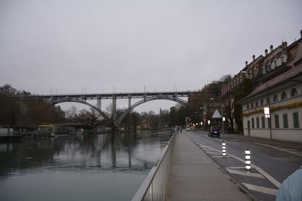 One of my favorite walks in Bern is to slowly walk down the covered Kramgasse and then the Gerechtigkeitsgasse. Just before the bridge over the Aare that leads to the famous bear pit, which fortunately is no longer a bear pit, you descend to the left of the road to the banks of the Aare. You can follow the road, but you can also take a covered staircase. Once you reach the bottom, you walk past houses that occasionally suffer from extremely high water levels in the Aare, which flows quite wildly here. Eventually, you will arrive at a road directly along the Aare and walk down to the Kirchenfeldbrücke. This bridge was opened in 1883, initially only for horse traffic and pedestrians. Now cars and trams drive over it, so the bridge has been reinforced several times. The bridge is 37 meters high.